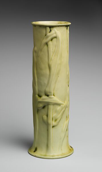Many of Tiffany Studios pottery vases and bowls began as enamels. This vase is a direct copy of an enamel copper model of the same design (see 1981.444). Unlike the bright, multihued naturalistic enamels, the pottery versions were often glazed in a semi-matte monochrome finish.
