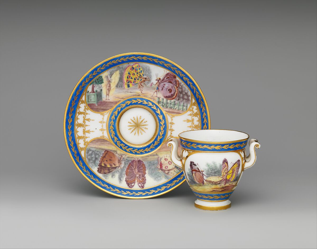 The lighthearted whimsy of the painted decoration of this cup and saucer is surprising considering the date at which it was executed, for in 1794 the period of repression and mass executions known as the Terror, which followed the French Revolution, was just ending. The decorative scheme is composed of four reserves (panels) of butterflies masquerading as humans. Their gestures and costumes reflect a decidedly playful spirit, despite the dueling depicted in one scene, and several of their poses and the portrayal of one as Harlequin are references to the popular theatrical tradition of the Italian Comedy. Three of the four scenes are copied, with some variations, from a set of six etchings entitled Essai de papilloneries humaines by Charles-Germain de Saint-Aubin (1721–1786) that were published shortly after 1756.