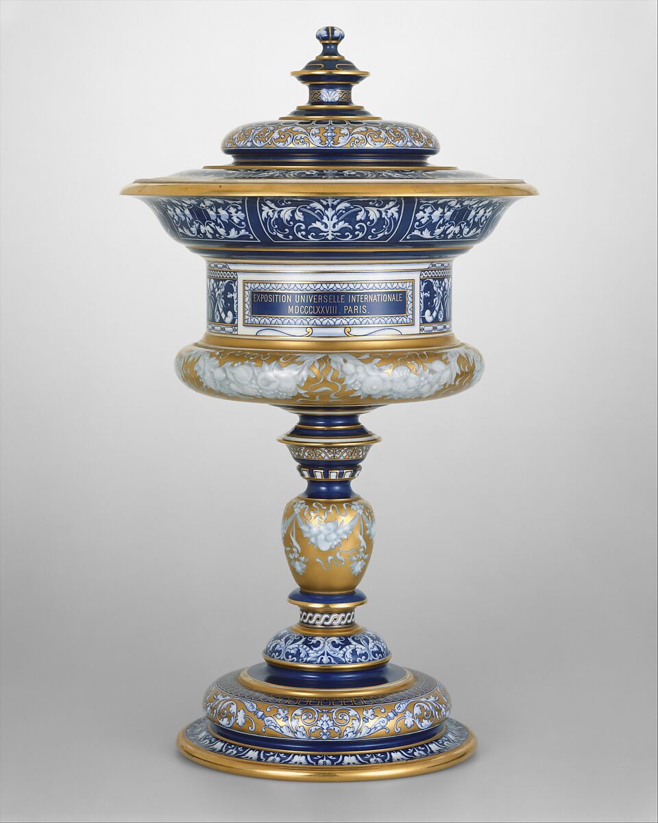 At the end of the nineteenth century, convinced that ornament should be appropriate to form and material, advocates of modernism criticized revivalist pottery as uninspired and pretentious. Imitation and love of display were cited as roadblocks to progress in the potter’s art. Made in a Renaissance-revival style, this cup was an official presentation piece for the winner of first prize at the Exposition Universelle of 1878. Of the disdained French national manufactory at Sèvres, one critic wrote, "The colors are insipid and often vulgar; the decoration rarely quits the beaten track of the usual Sèvres flower and figure subjects. Sèvres is lingering in the traditions of [the past]. It remains deaf to the fame of living and modern art."
