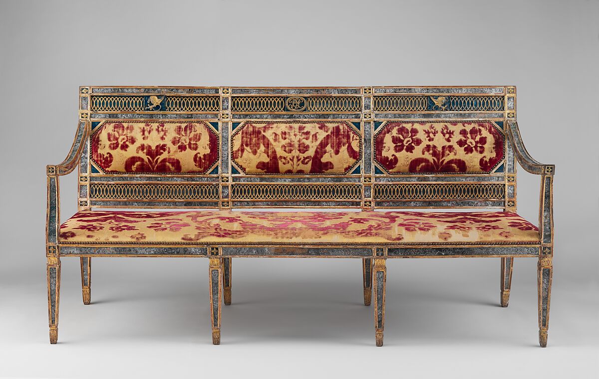 This settee is from a large set of seat furniture, which included at least four settees and twenty side chairs. It was formerly thought to have been commissioned for the Villa Palagonia at Bagheria near Palermo, but the provenance remains undocumented, and the initials in the cipher at the center of the back, "PPL," are as yet unidentified. The reverse-painted glass panels in imitation of agate, lapis, and marble are a distinctive feature often used on late-eighteenth-century Neoclassical Sicilian furniture.