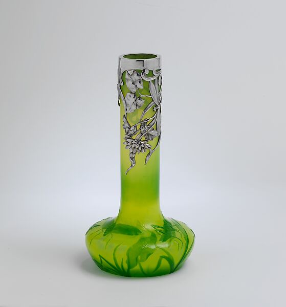 The ornament of the body, imitating cameo glass, was molded not carved. The outer layer of green and the mount include dragonflies and other aquatic life.