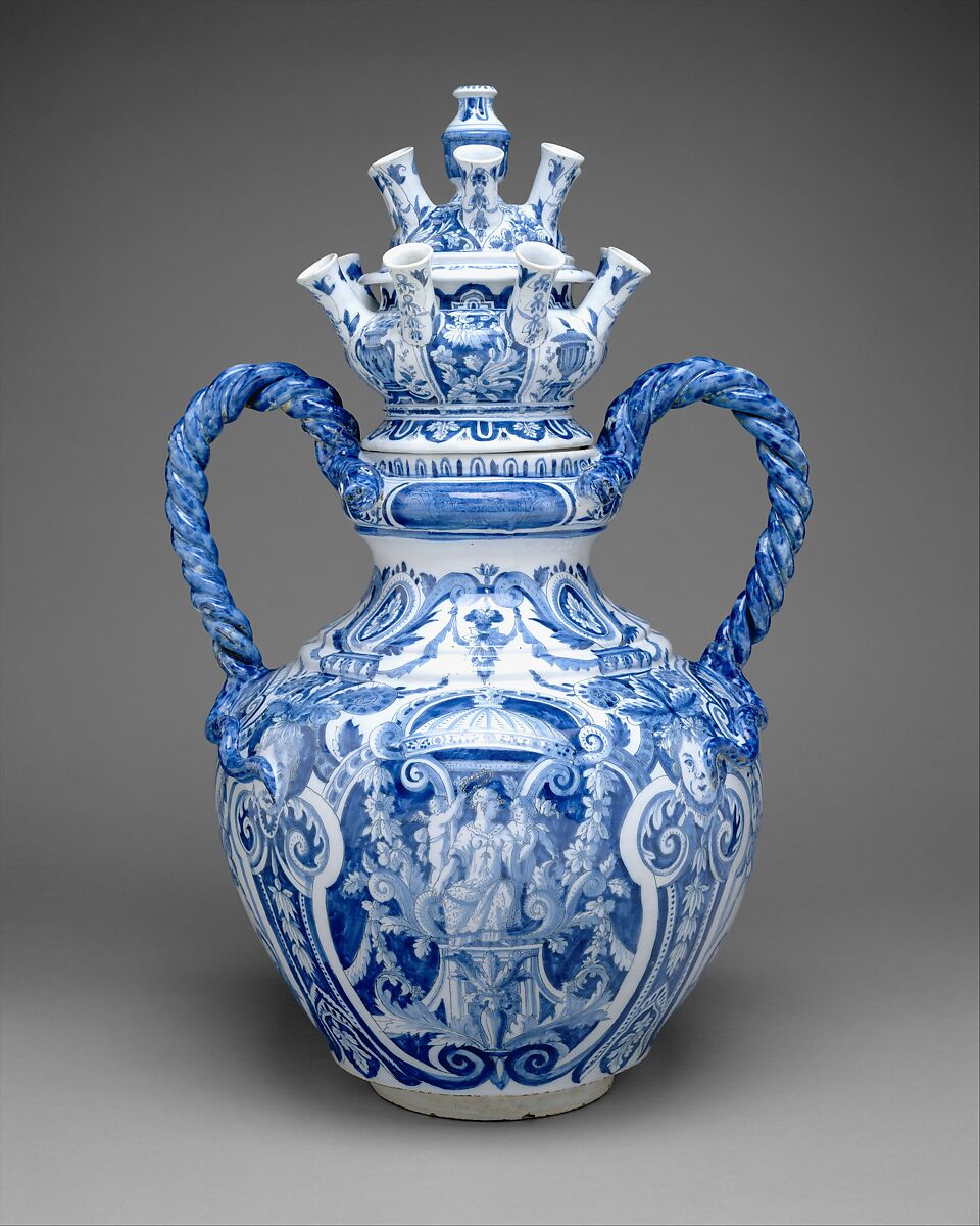 With handles consisting of entwined snakes and a cover fitted with two tiers of nozzles for flowers, this vase belongs to a group of impressive Delft show pieces on stands made during the time that the Dutch stadtholder William of Orange and his wife Princess Mary Stuart were co-sovereigns of the United Kingdom. Many of these ambitious designs were created at De Grieksche A (Greek A) factory when it was owned by Adrianus Kocx (1687–1701). Amusingly, the decoration on the cover includes a multi-nozzled flower vase. The original base, presumably decorated with ornament to match, is lost.