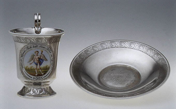 The silvered decoration alludes to a twenty-fifth wedding anniversary that is commemorated in an inscription on the saucer.