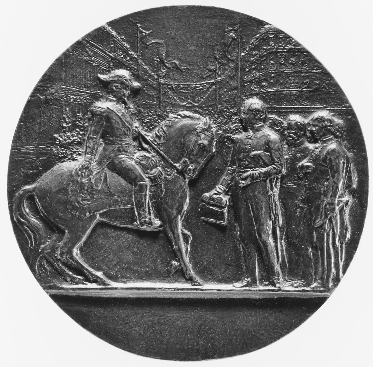 This is the specimen that was shown in the 1967 exhibition at the hôtel de la Monnaie in Paris, "La Medaille en France de Ponscarme a la fin de la Belle Epoque," an exhibition that did much to rekindle interest in Ponscarme and his contemporaries. The casting faithfully captures in an almost impressionistic way the flickering surfaces of the wax model that preceded it. The deed commemorated is the completion of one of the broad new thoroughfares of Second Empire Paris, the boulevard de Strasbourg, which leads to the Gare de l'Est, its pointed roof visible here at the vanishing point. Baron Haussmann, city planner par excellence, is the gentleman nearest the equestrian emperor.