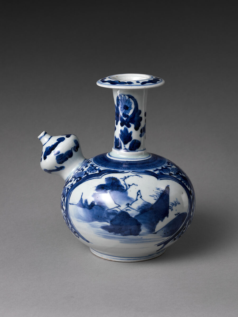 - Medium: Hard-paste porcelain painted with cobalt blue under transparent glaze (Hizen ware)