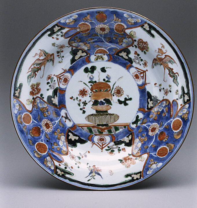 In response to the great demand for Japanese Imari, the Chinese developed a version of their own for export. In this so-called Chinese Imari, famille verte enamel colors (dominated by shades of green) are added to the basic palette of red, blue, and gold.