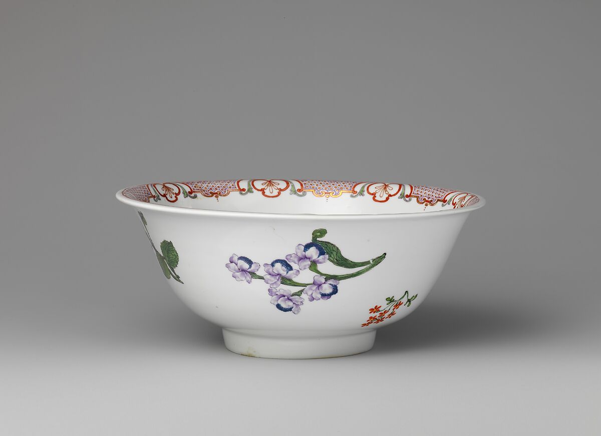 The floral decoration on this bowl is particularly beautiful and must have been executed by one of Du Paquier’s most accomplished flower painters. The restrained composition on the exterior, consisting of individual sprays of intensely bold anemones, a soft drooping rose, and night-scented stock, is contrasted with the dense decorative border of Laub- und Bandelwerk on the inside, where a few more blossoms, including anemones, are found.