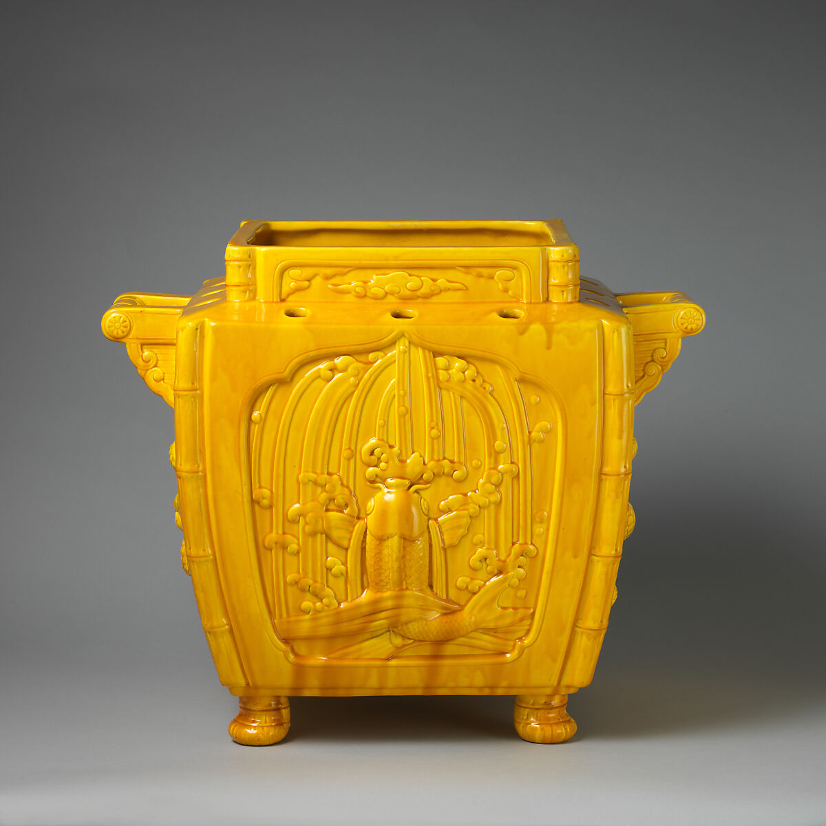 There is no known shape in Asian ceramics that correspond to this vessel. Various elements, such as the bamboo borders and the cloud formations within frames on the neck, are obviously derived from Chinese art. The theme of the "carp leaping in waves" symbolizes success in civil-service examinations-once the carp leaps over the "dragon gate," it becomes a dragon.