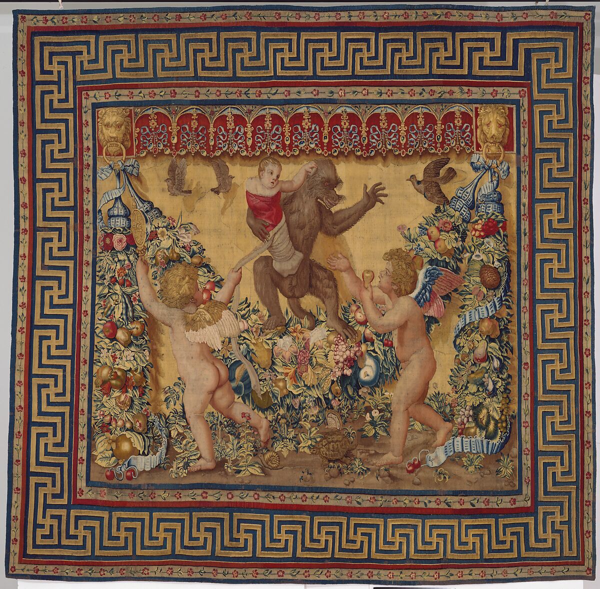 This tapestry is one of eight that reproduce, in part, a set of twenty ordered in 1520 by Pope Leo X for the Hall of the Consistory in the Vatican. The design was conceived as an allegorical celebration of the golden age under the Medicis and under Leo X in particular. The theme and format of the set may have been conceived by Raphael (both of the putti in this tapestry derive from lost paintings by him), but the designs were executed by his pupils. Several of the preparatory sketches are in the hand of Giovanni de Udine, while the cartoons were painted in Brussels by Tommaso Vincidor, who traveled there for that purpose in 1520.
