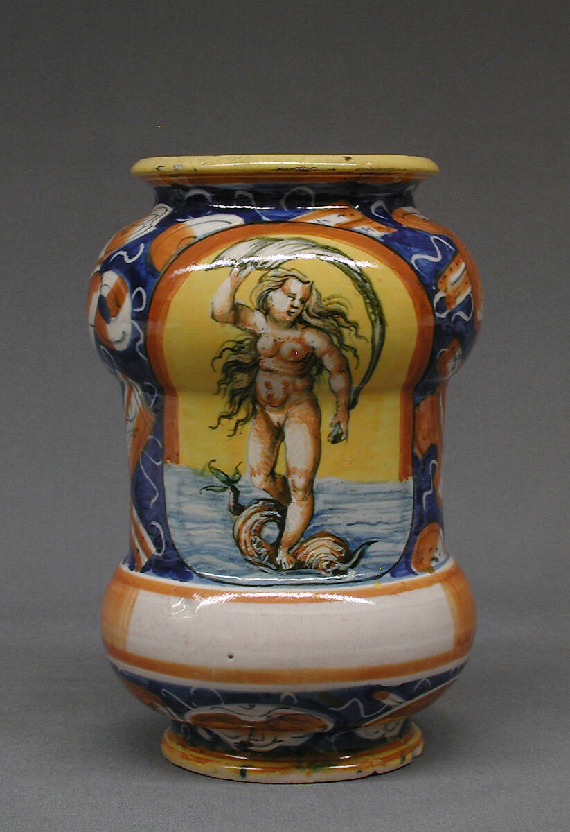 The goddess Fortuna is depicted standing astride a sea-monster on each of these five jars (see 53.225.83, .84 and 41.190.343a, b–.345a, b). She is likely a symbol identifying the pharmacy to which the objects belonged. It is clear from subtle differences in the decoration that a number of artists were involved in making this set. On the three lidded jars, the roundel creates an illusion of a window opening onto a deep pictorial space. The painters have achieved an ambitious perspectival view—more impressive still on the two vessels with convex surfaces. On one, there is an amusing modification to the representation of Fortuna, who puckers her lips to blow wind into her own sail. The three lids are original, a rare survival.