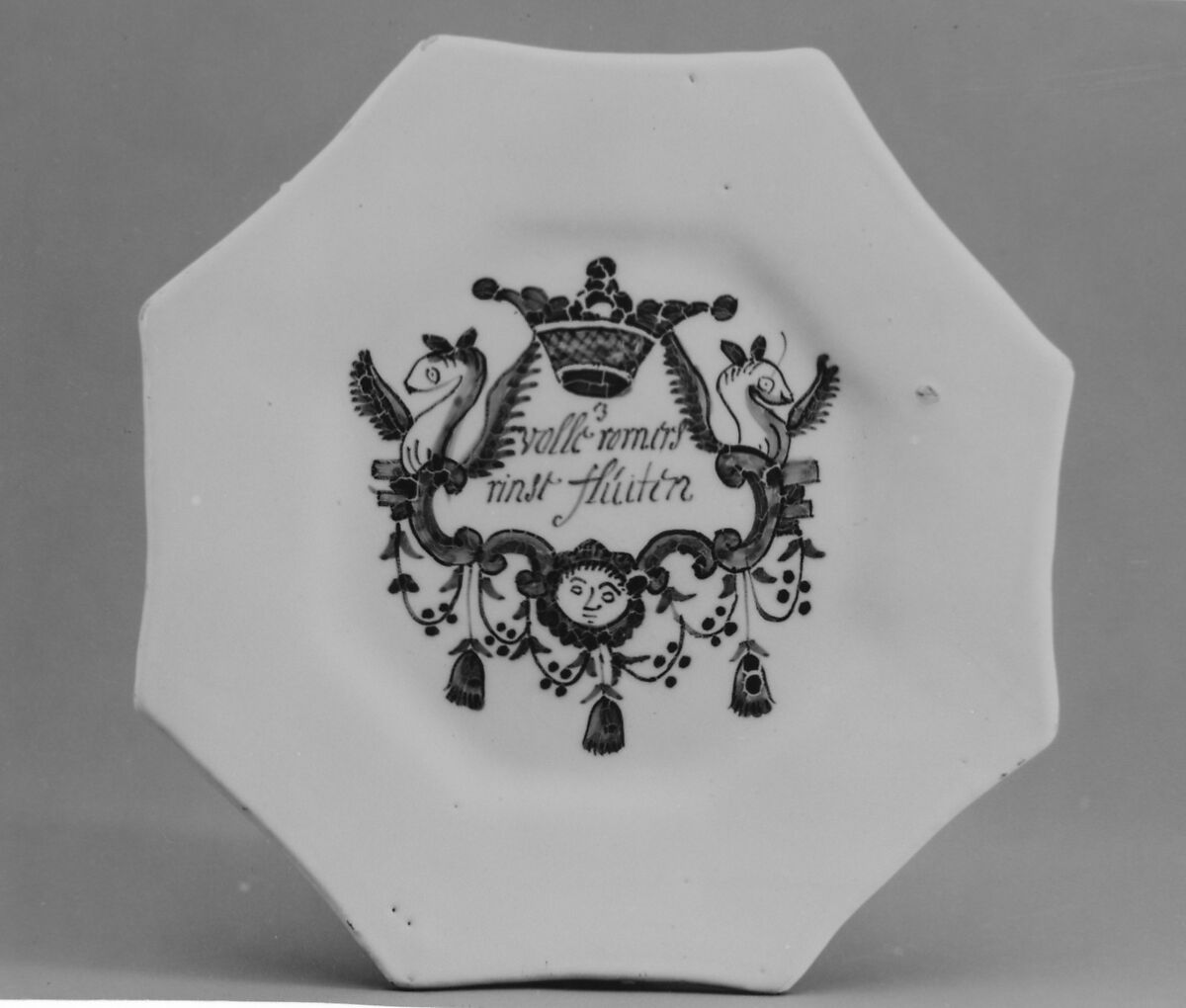 The legends inscribed in the well of these plates (1977.22.5–.10) make one continuous verse. When read in numerical sequence, the inscription is: "Clean plates and napkins/ tablecloths without stains/ full glasses and fine flutes/ make the stomach open/ but the mistress of the house who is joyful/ makes the real happiness of the table".