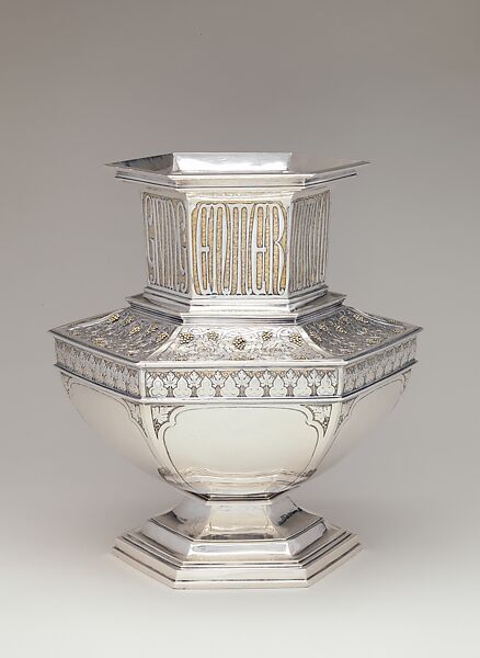 These exquisite altar vases (see also 2011.347) are among the finest known examples of American Arts and Crafts silver. They were designed by the silversmith Arthur J. Stone, who trained and worked in England and Scotland before immigrating to the United States in 1884. Made for use on the altar of the chapel at Pomfret School in Pomfret, Connecticut, the vases were commissioned by Lydia Clark of Philadelphia in memory of her son, George Newhall Clark, who died in 1906, two years after he graduated from Pomfret. Refined and opulent, the vases display Stone's rich ornamental vocabulary as well as his exceptional technical skills. The bold hexagonal bodies were hand-raised to Stone's design by his workshop's leading craftsman, Herbert Taylor, and then painstakingly chased and gilded by Stone himself. Appropriate to chapel plate and to the ideology of the Arts and Crafts Movement, the panels of interlaced grapevines, trefoil-and-leaf banding, and other ornamental motifs reference medieval sources. On the neck of each vase a verse from the Book of Common Prayer is chased in Gothic lettering against a sumptuous gold ground. Arthur Stone's commitment to hand-wrought silver and manifestly honest craftsmanship sustained him until his retirement in 1937 at the age of ninety.