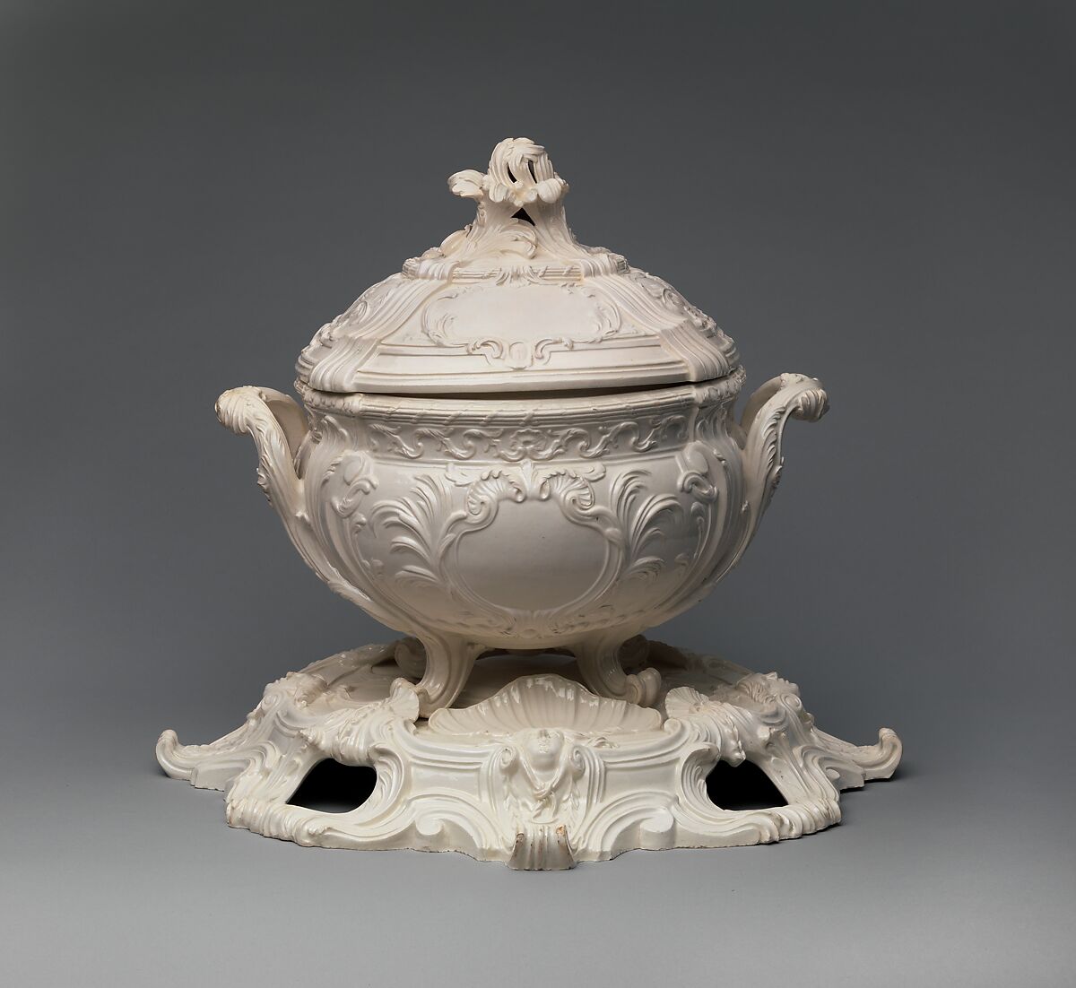 Faience, or tin-glazed and enameled earthenware, first emerged in France during the sixteenth century, reaching widespread usage among elite patrons during the seventeenth and early eighteenth centuries, prior to the establishment of soft-paste porcelain factories. Although characterized as more provincial in style than porcelain, French faience was used at the court of Louis XIV as part of elaborate meals and displays, with large-scale vessels incorporated into the Baroque garden designs of Versailles. Earlier examples of French faience attest to the strong influence of maiolica artists from Italy. Later works demonstrate the ways in which cities such as Nevers, Rouen, Lyon, Moustiers, and Marseille developed innovative vessel shapes and decorative motifs prized among collectors throughout Europe.