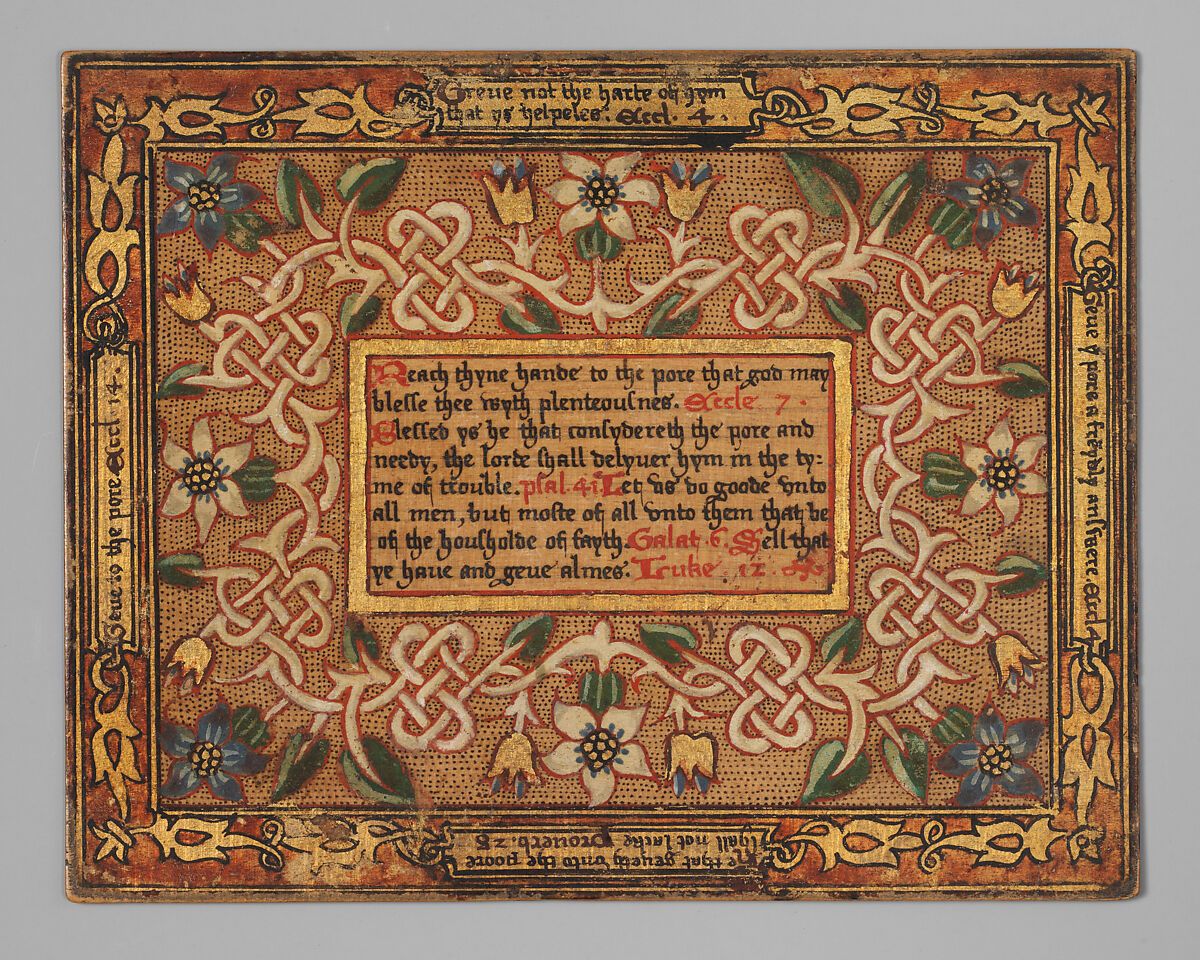At the end of a banquet it was customary to serve fruit or sweetmeats on the undecorated side of wood trenchers such as these. Afterwards, they were turned over and the moralizing quotations from the Bible read aloud to the assembled company.