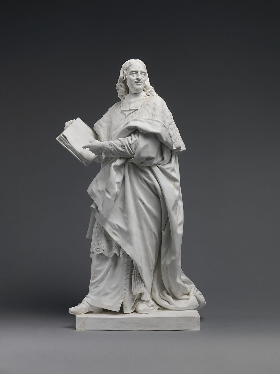 In 1779 Pajou exhibited a marble statue of Bossuet executed as part of a series by numerous sculptors of portraits of twenty-seven "Great Men" of France. Three years later the comte d'Angivillers, director of the Batiments du Roi, who had initiated the program on behalf of Louis XVI, instigated the production at Sevres of small-scale versions of these statues in the hope of attracting a wider market. This figure of Bossuet, cast from Pajou's own reduction of his marble, is one of twelve known Sevres models from the series. Bossuet was the preeminent churchman of his time, renowned as an orator of exceptional power. Pajou portrays him as bishop of Meaux,