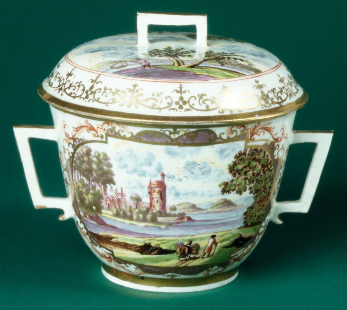 The ensemble (1982.60.248–.251) is an assembled one, although one cup and saucer, both painted with riverscapes, are a fairly close match and are by the same hand. The xecond cup, also by the same artist, depicts an architectural landscape on one side, a winter skating scene opposite. On the saucer is a garden pavilion painted by a different artist. One cover is a modern replacement.