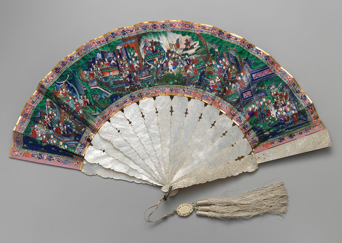 - Title: Folding Fan with Scene of Figures in a Courtyard Garden and Stately Entrance