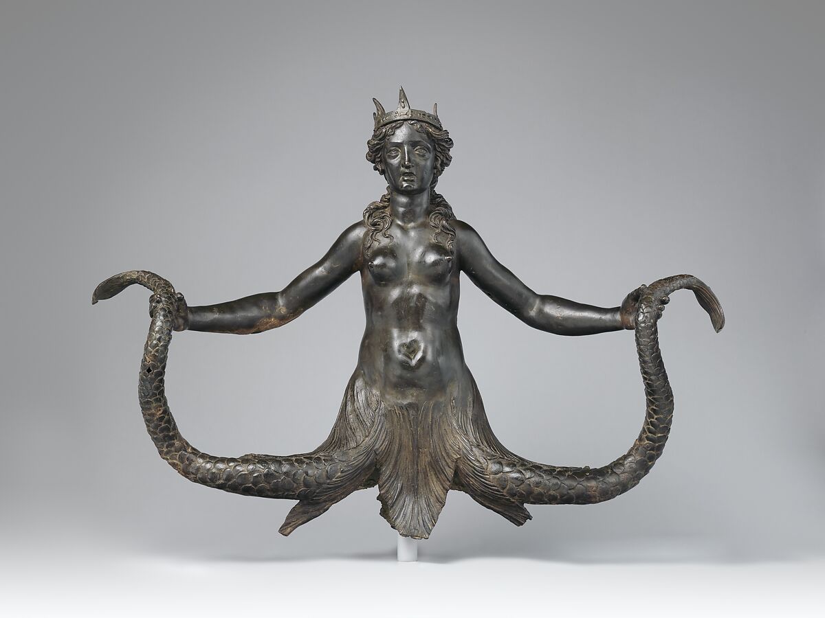 Confidently modeled and roughly cast, our bronze possesses a visual allure consonant with its subject’s storied song. The figure’s youthful physique, parted lips, and confident manipulation of her tails communicate the vivacity and disconcerting hybridity of the mythological subject. Smooth skin, ribbed fins, patterned scales, and especially the flicker of massed hair over the shoulders and down the back reveal an artist adept at arranging sculptural forms and manipulating the play of light across volume and a variety of surfaces. With the shock of familiar anatomies—human and piscine—in unexpected union, and with all the resplendence of large-scale, metal, light-reflecting sculpture, the Siren undoubtedly continues to fulfill much of its original promise in spite of the effects of time.[1]