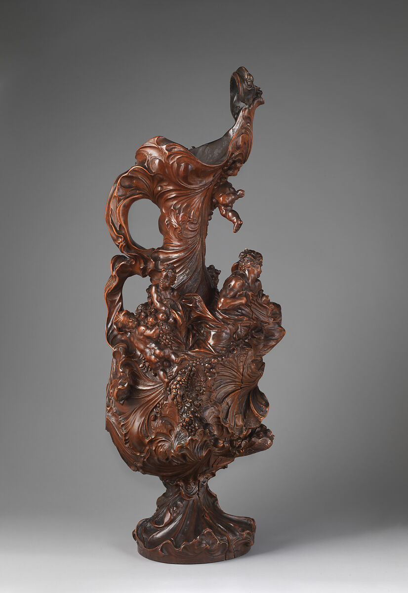 Composed of several pieces of alder wood, this highly inventive ewer with its slender neck, double handle and exuberant spout, is a marvel of virtuoso carving. Following the tradition of designs for ornamental vases by seventeenth-century artists such as Jean le Pautre or Claes Jansz Visscher, the ewer's profile is enveloped by a multiplicity of decorative elements. The putti, garlands of fruit and flowers, and large sinuous foliage recall the spirited and fluid style of Flemish carving as expressed in elaborate sculpted pulpits and the balustrades of grand staircases. The reclining figure in the center, crowned with vines, and his female companion may well be Bacchus and Ceres, while the playful putti on the sides may be alluding toVenus. If so, the ewer could be an illustration of a famous emblem: "Sine Cerere et Baccho, friget Venus" (without food and drink, Venus is left in the cold). The ewer has not yet yielded all its secrets; was it, for instance, part of a larger decorative ensemble to furnish a stately diningroom or perhaps a model to be executed in silver? Neither is it known to whom the name Henricus Ioseph W…, inscribed in ink underneath the base, refers.