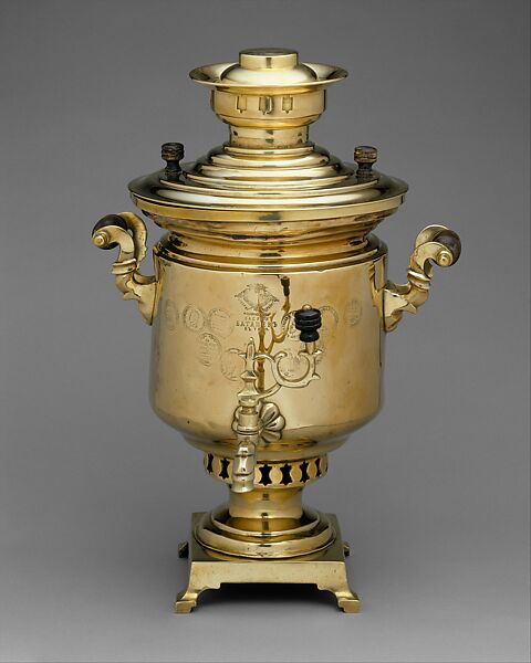 A strong brew of tea contained in a teapot and warmed on the top of the samovar can be mixed with the desired amount of water supplied from the spigot below. The water in the samovar is kept hot by an interior well filled with glowing coals.