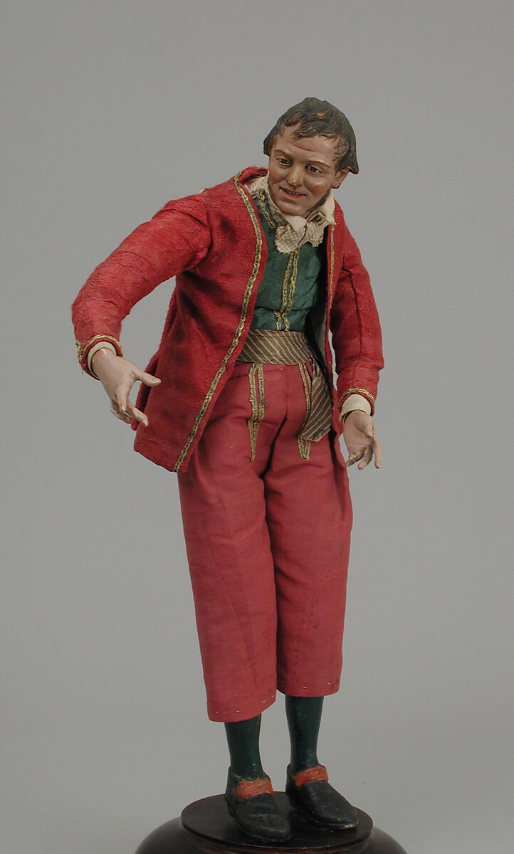- Medium: Polychromed terracotta head and wooden limbs; body of wire wrapped in tow; silk and linen garments; wood mandolin