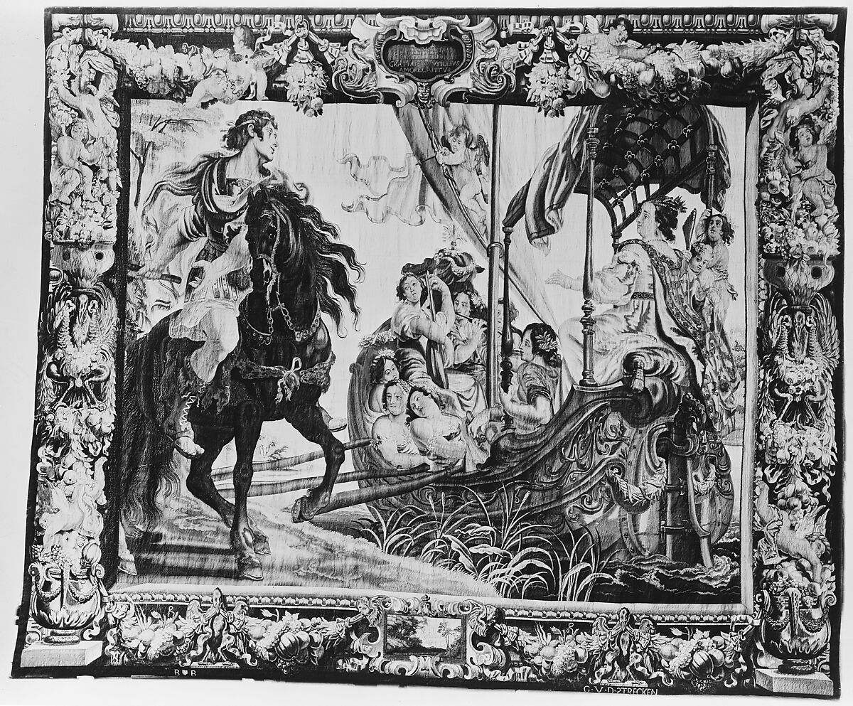 This panel depicts the moment at which Antony first sees Cleopatra, who is riding in the stern of a barge, fanned by youths dressed as cupids (as described by Plutarch). Cupid, leaning against the sail of the barge, aims an arrow at Antony, who is riding a spirited horse. The Latin inscription in the upper cartouche reads "Antony, sent to compel her, is captured by love of her." The exuberant style is typical of the tapestry designs of Justus van Egmont, who blended the dramatic figures of Rubens with a relish for billowing draperies and decorative details. Although the date of conception is unknown, sets of this design were being produced in Brussels from the early 1650s, and it evidently enjoyed considerable popularity. Several partial sets have survived, some numbering more than ten pieces.