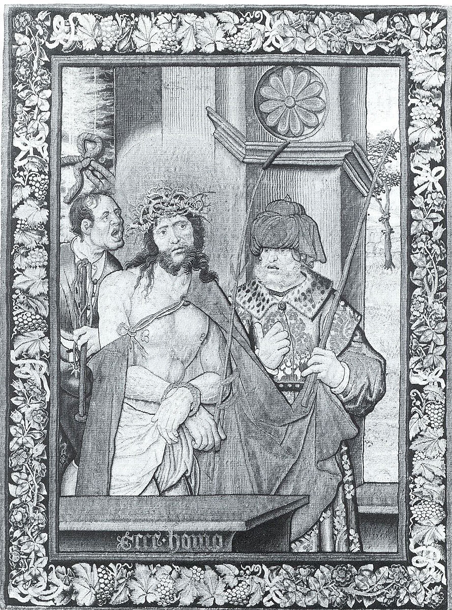 The bound Christ, humiliated and all but naked, mockingly draped in an imperial purple cloak and thorny crown, is presented to the jeering crowd, as described in the Bible (John, 19:5), the inscription woven in gilded silver, “ECCE HOMO” declaring ‘here is the man’. In a device popularized by Albrecht Dürer, the crowd is not actually represented; instead, it is as if his tormenters present Christ directly to us, the tapestry’s viewers, making us complicit in his degradation and rendering this hanging ideal as a tool for devotional contemplation and meditation.
