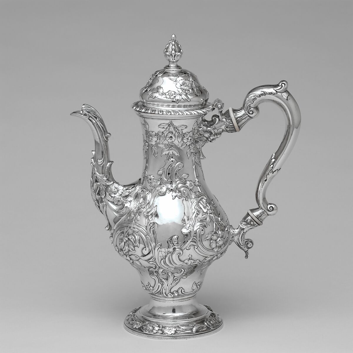 The wealthy colonial merchant Samuel Verplanck owned several pieces of London silver, including this coffeepot marked by Benjamin Breewood II in 1762. Its inverted pear-shaped repoussé-decorated body and spout represent the height of English rococo styling. Samuel was sent to study banking in Holland, where he met and married his cousin Judith Crommelin. The couple returned to New York in 1763 and moved into the family’s elegant Wall Street home. Verplanck family silver, furniture, and paintings now in the Metropolitan’s collection exemplify the imported luxury goods owned by prominent colonists.