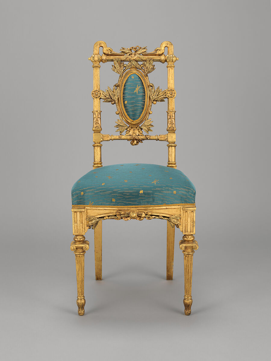 Originally fashioned by Herter Brothers for Vanderbilt’s previous residence, this side chair, one of a pair, was incorporated in the boudoir of his new mansion on Fifth Avenue. While Vanderbilt desired to construct a completely new and modern residence, the boudoir was part of the family’s apartments not used for formal entertaining and thus offered the opportunity to reuse furnishings. Hallmarks of Herter’s earlier style include the turned legs and ionic capitals, the overall form of the back, and the graceful swans’ necks and heads at the crest rails. For the new room, Christian Herter reupholstered the chairs in a custom fabric, manufactured in France, of his own design— a Japanesque pattern with lines of gold thread to suggest water, interspersed with small dragonflies, tiny waterlily blossoms, and leaves.