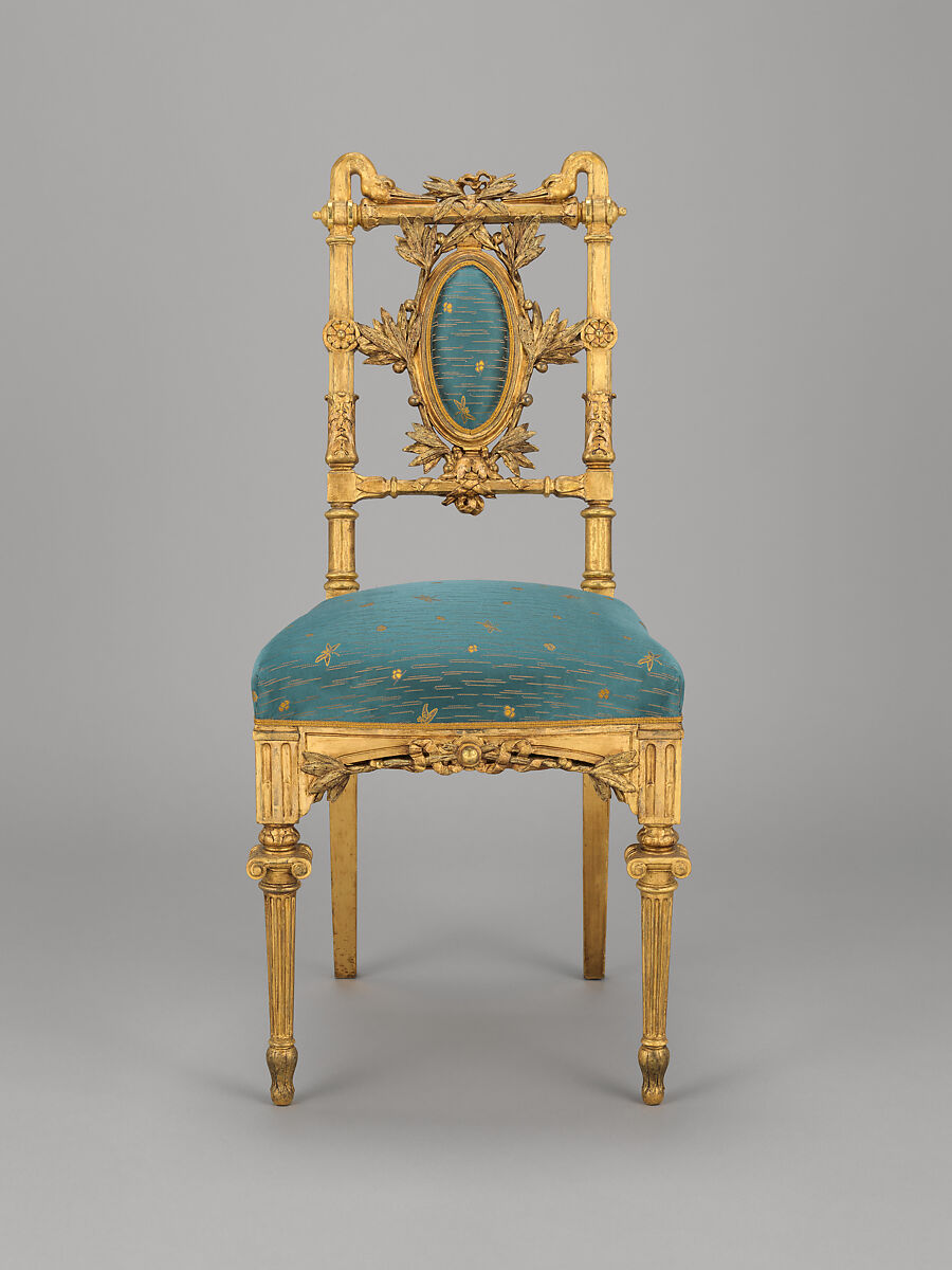 Originally fashioned by Herter Brothers for Vanderbilt’s previous residence, this side chair, one of a pair, was incorporated in the boudoir of his new mansion on Fifth Avenue. While Vanderbilt desired to construct a completely new and modern residence, the boudoir was part of the family’s apartments not used for formal entertaining and thus offered the opportunity to reuse furnishings. Hallmarks of Herter’s earlier style include the turned legs and ionic capitals, the overall form of the back, and the graceful swans’ necks and heads at the crest rails. For the new room, Christian Herter reupholstered the chairs in a custom fabric, manufactured in France, of his own design— a Japanesque pattern with lines of gold thread to suggest water, interspersed with small dragonflies, tiny waterlily blossoms, and leaves.