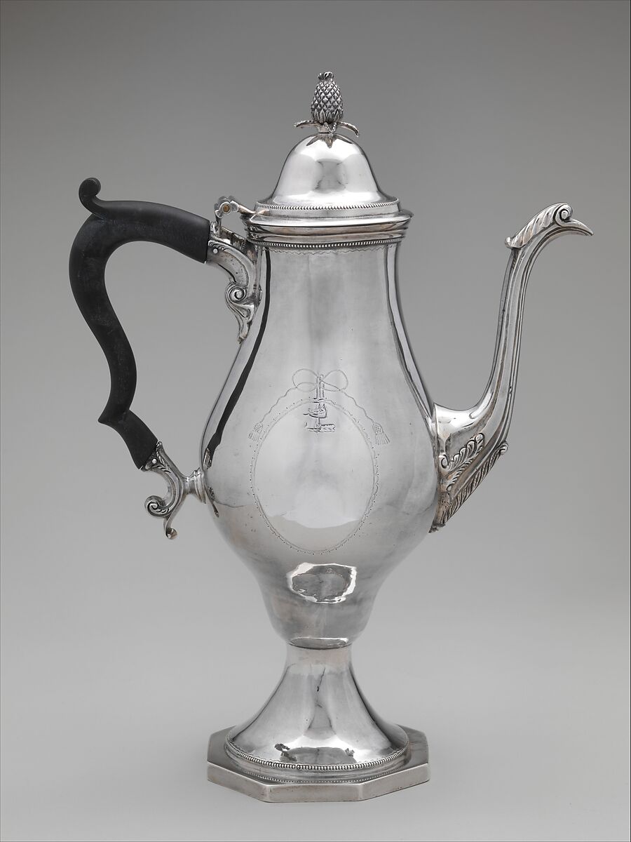 This coffeepot is accompanied by a sugar urn and a creamer. These pieces are engraved with the crest of the Howe family.