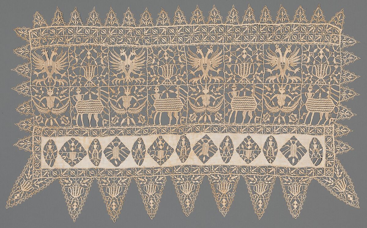 Punto in aria—literally, "stitches in the air"—is one of the earliest styles of needle lace, which is itself developed from cutwork of primarily geometric design. When lacemakers transitioned to using a foundation of threads laid out according to a pattern drawn on parchment, they were able to incorporate more fluid lines and curves into their designs.