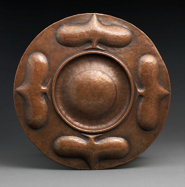 Founded by Edward C. Howe in 1905, Onondaga Metal Shops was a short lived company, operating in Syracuse, New York only from 1905 to 1906, when they were purchased by Henry Benedict and renamed Benedict Art Studio. Both companies focused on the production of hand hammered copper and brass wares, and their work represents the artistry and originality that characterized the best of the Arts & Crafts movement. The designs produced by Onondaga Metal Shops are indebted to forms produced in Britain and at Gustav Stickley’s Craftsman Workshop. Indeed some wares, including this charger, so closely resemble objects made at Craftsman Workshop that they must have been produced by a craftsman or craftsmen with direct knowledge of and experience with Gustav Stickley’s shop. Syracuse, New York, was a leading center for craft production during the early years of the twentieth century, with Craftsman Worships, L & J.G. Stickley Company and Adelaide Robineau’s pottery all based in the area. This Onondaga charger exemplifies the creative energy that typified the Arts & Crafts communities of Syracuse.