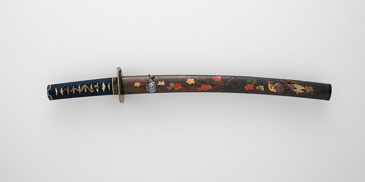 The mounting features a scabbard lacquered to resemble tree bark and decorated with maple leaves and an ornament in the shape of a cicada. With a snail that forms the cord knob (kurigata) and snakes as hilt ornaments (menuki), it is likely that the design refers to a popular East Asian hand game (Japanese: san-sukumi ken, 三すくみ拳) that was introduced to the West as Rock Paper Scissors. The third element would be a frog. In China, the snail is replaced by a centipede, which, interestingly, appears on the sword guard (tsuba) here. The maker of the blade, Shigetake (重武), was active in Edo during the 18th century, but the lineage to which he belonged is unclear.