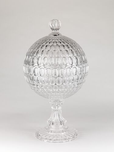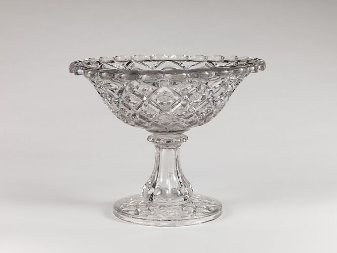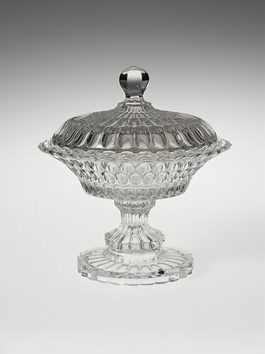 With the development of new formulas and techniques, glass-pressing technology had improved markedly by the late 1840s. By this time, pressed tablewares were being produced in large matching sets and innumerable forms. During the mid-1850s, colorless glass and simple geometric patterns dominated. Catering to the demand for moderately-priced dining wares, the glass industry in the United States expanded widely, and numerous factories supplied less expensive pressed glassware to the growing market. At the Exhibition of the Industry of All Nations at New York’s Crystal Palace in 1853, for example, the New England Glass Company exhibited 130 pieces of one design, "consisting of bowls, tumblers, champagnes, wines, and jelly glasses." This object belongs to one such service. Although the glass manufactory is not known, the glassware is very typical of the large services that were very popular with America’s middle class in the nineteenth century.