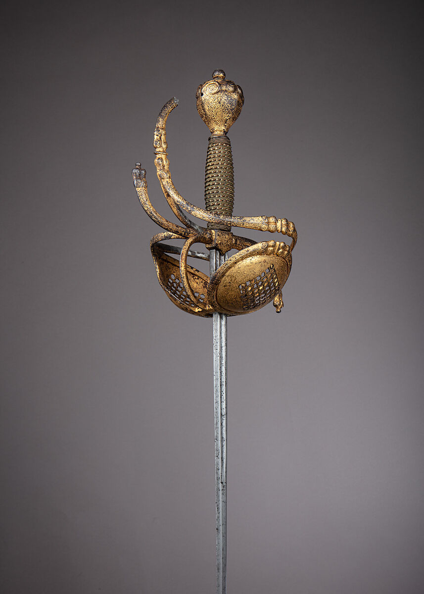The rapier was the principal civilian sidearm throughout the sixteenth and seventeenth centuries. Designed for cut-and-thrust fencing of progressively complex techniques, the rapier is characterized by a double-edged blade with an acute point and an elaborate guard for the hand. The guards, usually of iron or steel, were subject to a variety of embellishment. They were engraved, chiseled, gilded, damascened, and encrusted in gold and silver in keeping with fashionable styles.