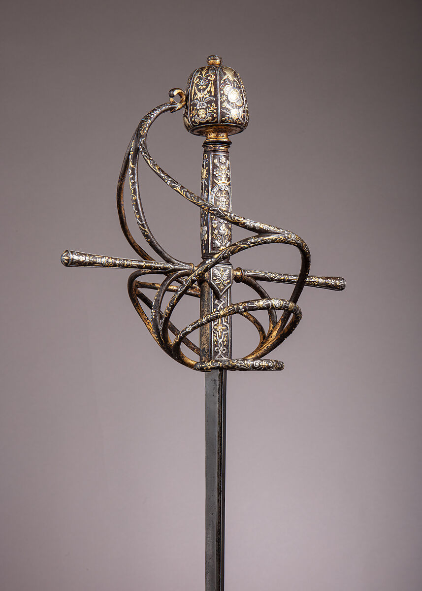 The hilt decoration includes the coat of arms of the Albani family, possibly Orazio Albani (1576–1653), ambassador from Urbino to the papal court. While clearly influenced by French ornament, the decoration has been attributed to Gasparo Mola (1567–1640), a medalist and goldsmith working in Rome between about 1620 and 1630.