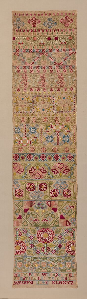 From the early 17th century into the early 18th century, long, narrow samplers such as this one were typical. Called "band samplers" because of the multiple bands of pattern, this type represents the transition from purely practical piece of fabric with patterns stitched for future reference, to something that is both decorative and functional.