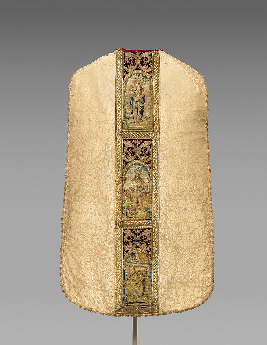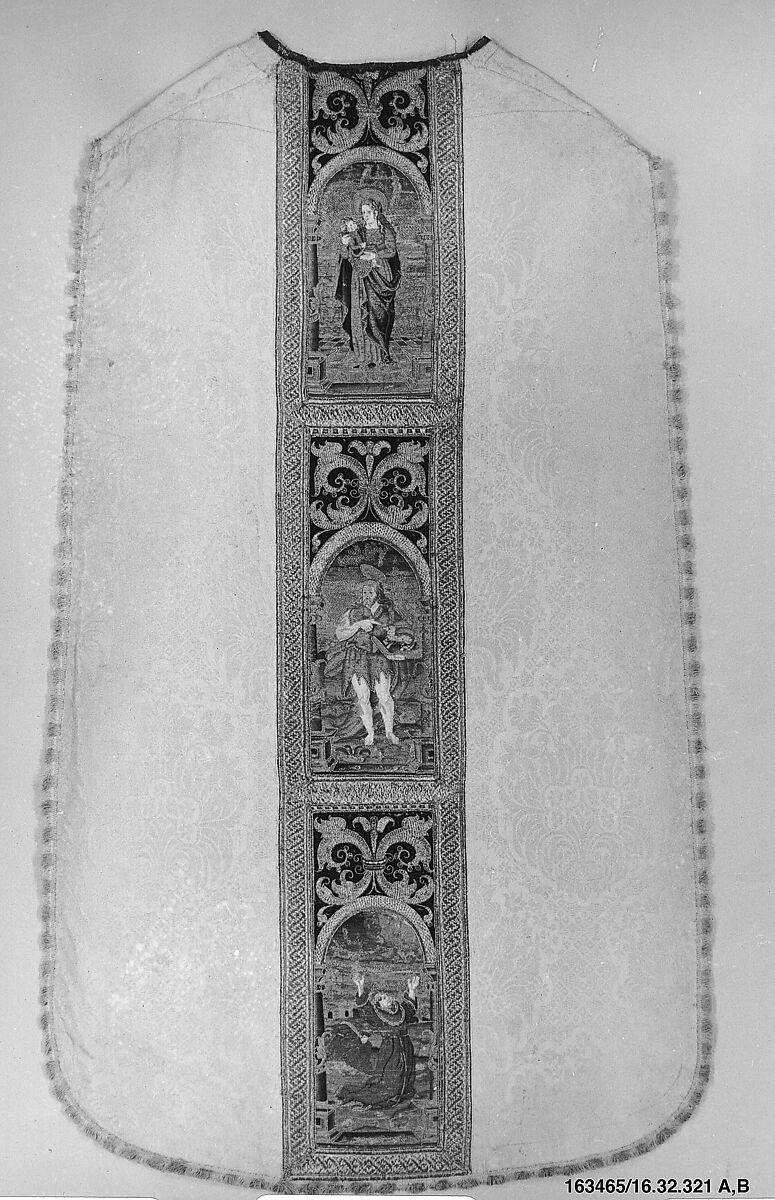 This tabard-like garment is a priest's chasuble. Probably tailored in the seventeenth century, it combines a very fine, high-quality white silk damask with older, repurposed sixteenth-century needlework. This beautifully worked embroidery on a red velvet ground provided an orphrey strip on the chasuble's reverse, decorated with figures of the Virgin and Child, John the Baptist, and Saint Francis receiving the Stigmata, each set within niches. In the mid-twentieth century, the orphrey strip from the chasuble's front (16.32.321b) was repurposed a second time, removed from this garment and temporarily applied to another, fragmentary sixteenth-century chasuble (56.166a,b).