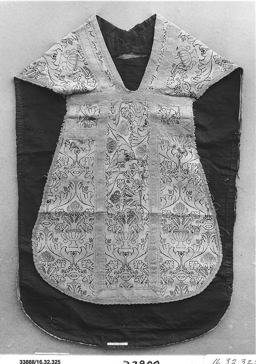 This chasuble– the tabard-like garment worn by a Catholic priest– embodies the nineteenth-century taste for older European historical styles, in this instance the Italian Renaissance. This machine-woven textile combines a main weft of pink with a candy-colored assortment of supplementary wefts in red, green and yellow– the latter in places embellished with a thin wrap of shiny lamella metal thread. Its pattern emulates that of a sixteenth-century silk. This vestment was clearly worn and used: the front is a patchwork of repairs, especially across the chest area.