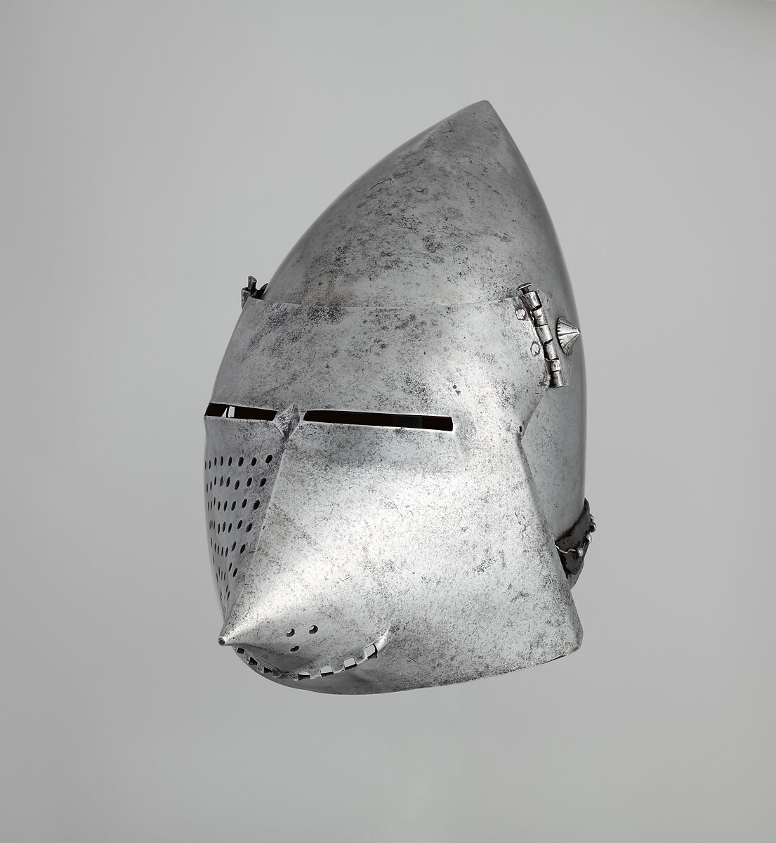 The visored bascinet served as the standard helmet worn throughout Europe from about 1300 to about 1420. The pierced studs along the rim held the aventail (a defense of mail covering the lower face, neck, and shoulders).