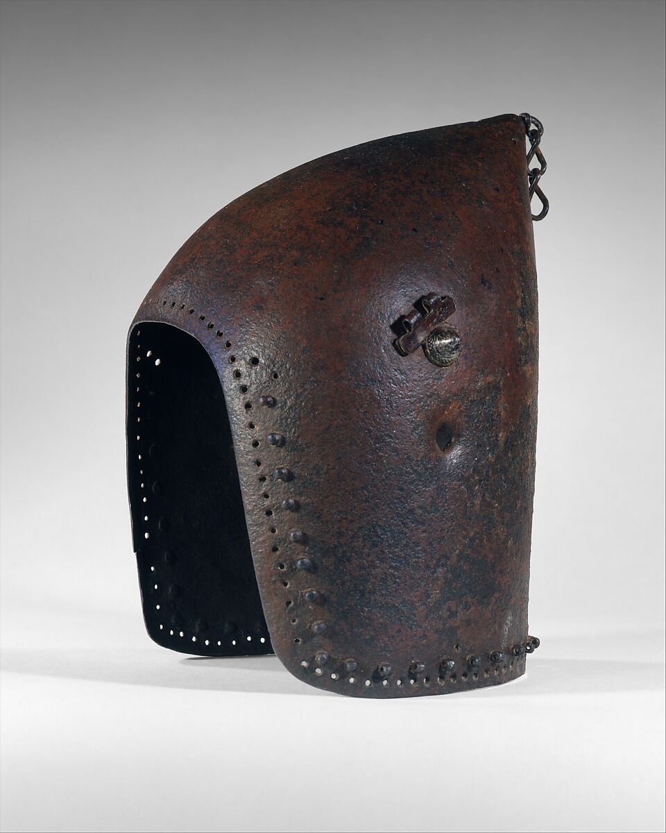 According to an attribution traceable only to the nineteenth century, this helmet was said to have been worn in battle by Joan of Arc (1412–1431) and to have been given by her to the church of Saint Pierre du Martroi at Orléans, where it hung over the main altar. Although the legend is probably untrue, the helmet does have what looks like damage from use in battle.