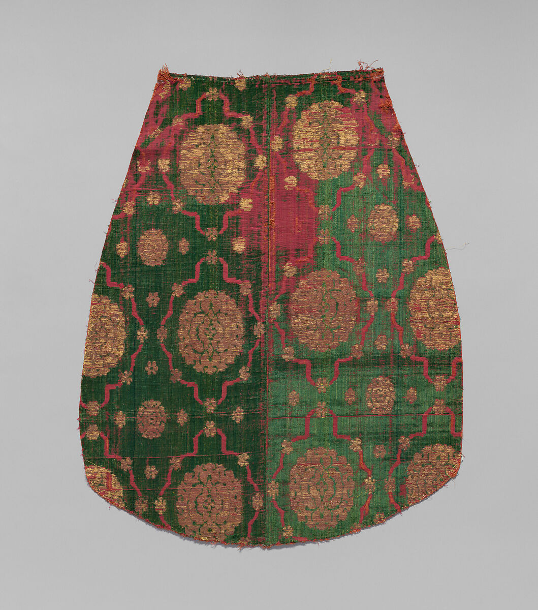 Although the loss of the green pile has exposed much of the red ground, it is nonetheless apparent that the velvet composing these two fragmentary strips was once very fine indeed: a thick, early velvet, with a large scale, bold repeat pattern in gold of ornamented roundels and six-petalled blooms. Many centuries after the velvet was woven, these two lengths were sewn together (one upside down to achieve an alternating matte and gloss of pile direction) in the partial shape of a chasuble, with the exaggerated tear-drop contour popular in the mid-nineteenth century. The Met's collection includes a small fragment of another velvet with this same design (2002.494.583).