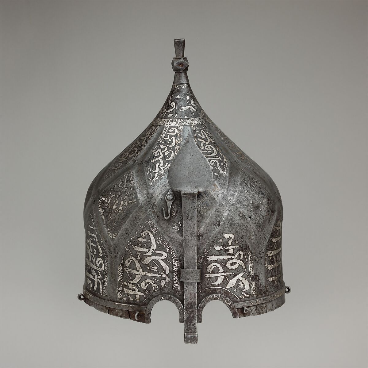 Turban helmets, together with mail-and-plate armor of matching decoration, were intended for the heavy cavalry and are recorded as early as the fourteenth century. The examples exhibited here appear to have belonged to the dynasty of Aq Quyunlu (White Sheep Turkoman) that ruled northwestern Iran and Anatolia in the fifteenth century. The inscriptions, damascened with gold and silver, glorify temporal rulers, wish the owner well, or give advice on how to attain virtue.