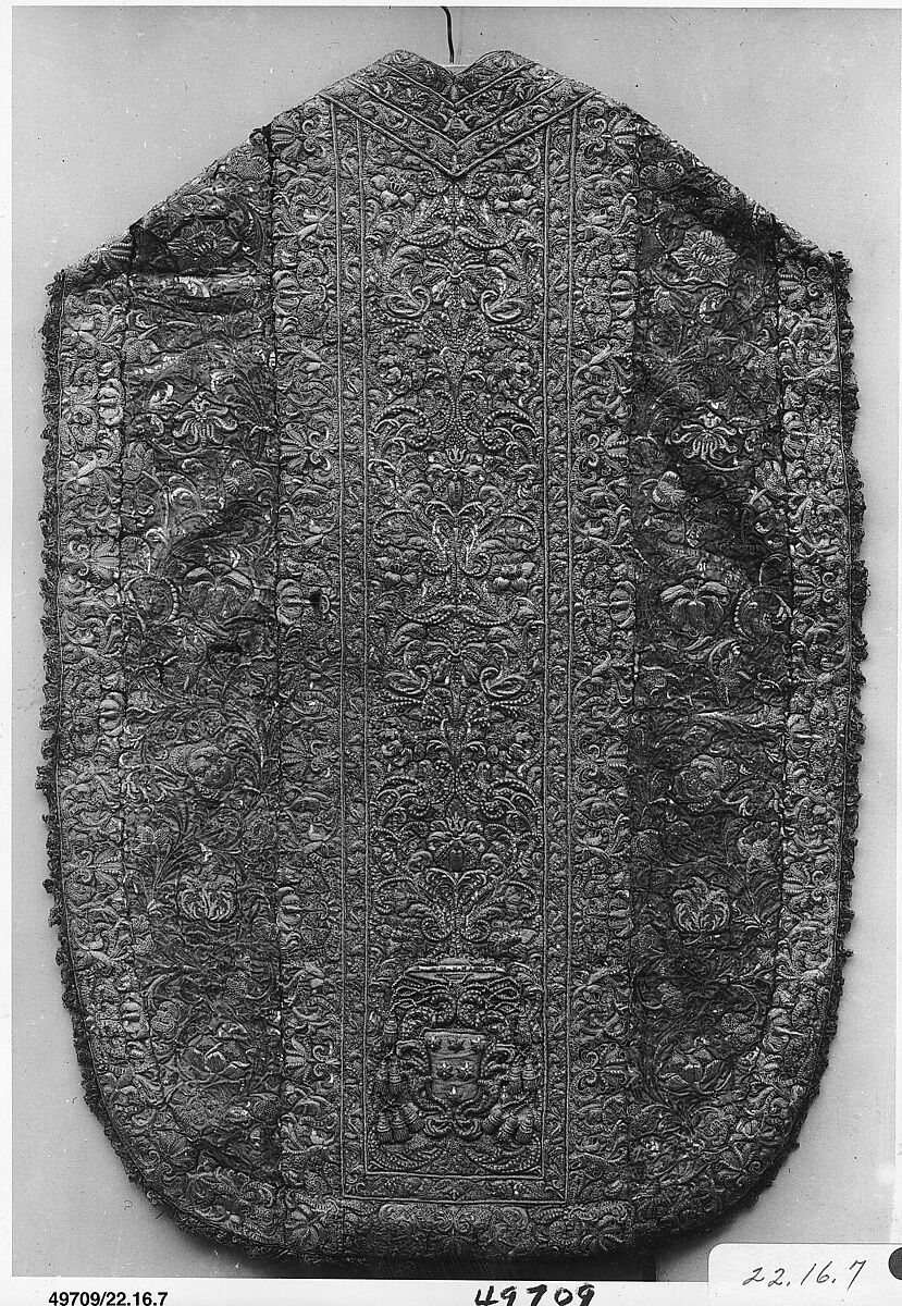 This magnificent chasuble was made for Luigi d'Amato di Sciacca, who was elected Bishop of Agrigento in 1589: nestled within the tendrils of its design is his family's coat of arms, surmounted by a bishop's twelve-tasseled galero hat. Also in The Met's collection is a matching bishop's stole (22.16.8), chalice cover (22.16.9), and bourse (22.16.10). Clearly, no expense was spared in the creation of these vestments. On a ground of sumptuous coral-colored silk a plethora of different thicknesses and profiles of silver and gilded silver metal thread has been embroidered to represent scrolling foliage, articulated by passion flowers and pomegranates- Christian symbols evoking Christ's death on the cross, and the multitude of souls redeemed by this sacrifice. It is unlikely that Luigi ever got to wear this splendid garment, however, dying in 1590 before his episcopal ordination and consecration.