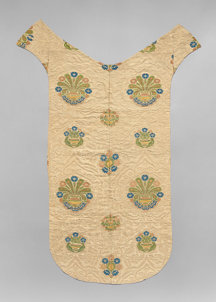 In a fine example of brocaded damask, talented weavers set polychrome motifs inspired by Persian designs- vases of stylized carnations, and pairs of birds- within a cream-colored ground whose elegant design is subtly articulated by the mat and glossy surfaces of the damask. The current assemblage, probably created by dealers in the early twentieth century to make a more saleable object, neatly combines as many as ten patches, their seams cleverly disguised. The current object has been made to resemble the reverse of a Christian priest's tabard-like chasuble garment, although details of the shaping, especially at the 'shoulders', and its narrow size reveal that this would never actually have functioned as such. Other examples of this textile's distinctive white and polychrome design survive in The Met's collection (46.156.143) and in European collections, in Paris (Musée des Arts Décoratifs) and San Gimignano (Museo d'Arte Sacra).