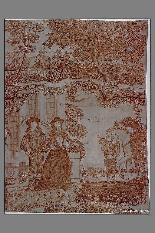 - Title: Copper plate printed cotton with King Charles I and Queen Henrietta Maria
