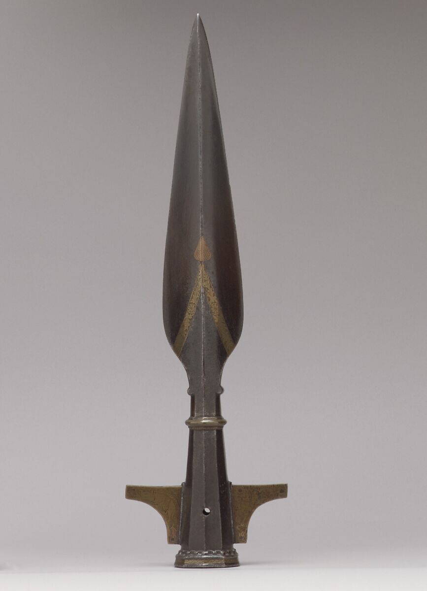 Spearheads such as this one were used for hunting various types of large game, especially wild boar, deer, and bear. The protruding wings on either side of the base were intended to check the forward momentum of a charging animal, keeping it at a safe distance from the hunter. The fine brass inlay decorating the spearhead is a reminder that hunting was a favorite pastime of nobility during the Middle Ages and the Renaissance.