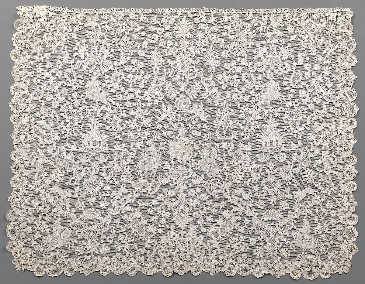 The quality of workmanship in this cravat end is consistent with its presumed exalted provenance. It is said to have been made for the Austrian empress Maria Theresa; given to her daughter the French queen Marie Antoinette; and then passed to the marquis de Chabert, a French admiral and astronomer, after which it descended in his family. The possibility of this association is supported by the crown at center resembling the Austrian archducal crown, though no further proof of the connection has been discovered. Illustrated are the royal pursuit of hunting on horseback and the eighteenth century interest in exoticism, as personified by the bare-breasted female riders wearing feathered headdresses at the center of the piece and the turbaned men reclining toward the bottom. Brussels bobbin lace, often called point d’Angleterre, is worked in parts and joined with a plaited hexagonal mesh called drochel.