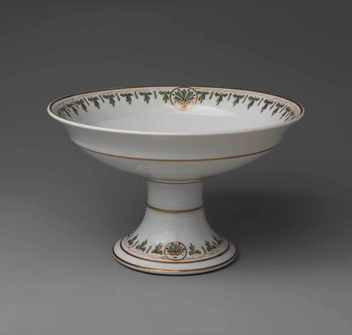 Union Porcelain Works was one of the most important and inventive American porcelain manufacturers in the second-half of the nineteenth century. In addition to their imaginative works designed by the German-born artistic director, Karl H. L. Müller, the firm’s mainstay was the production of heavy porcelain hotel dinnerware. This extensive service was made by Thomas Carll Smith, head of the Union Porcelain Works, as a gift to his daughter, Pastora Forest Smith Chace. The neoclassical decoration of the gilt bellflower and basket motif is complimented by turquoise enamel. Unlike the firm’s more eccentric and lavish designs created for their display at the Philadelphia Centennial Exposition in 1876, the pottery favored a more restrained classical style for their dinner services. This service descended in the Chace family.